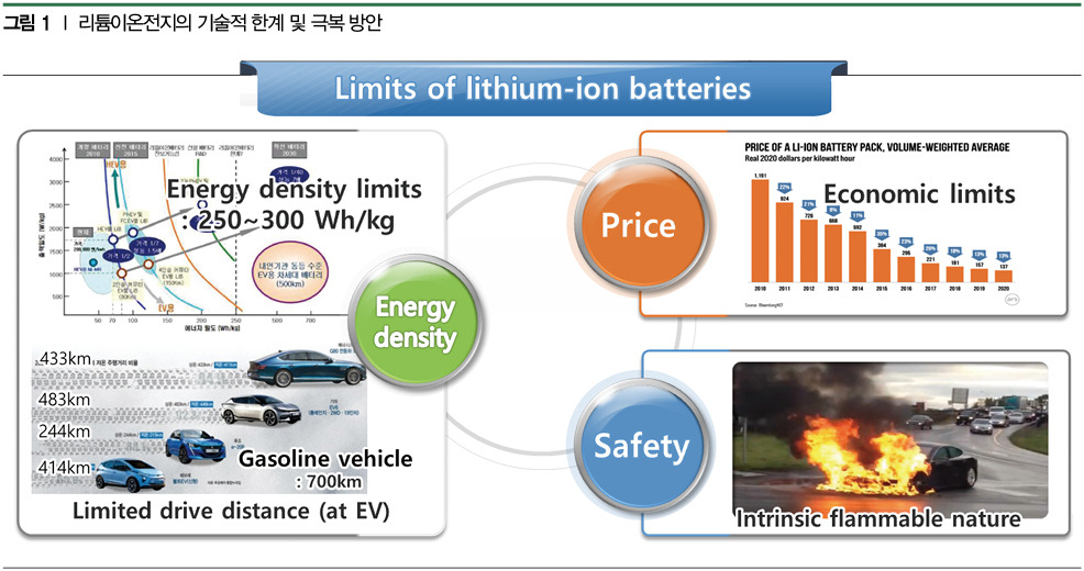 가격의 경우도 마찬가지이다. 현재의 리튬이온전지는 대략 100 $/kWh 수준이 가장 낮은 가격을 형성했을 시기이다. 리튬, 니켈, 코발트 등 주요 원자재의 가격 변동에 따라 전지의 가격 변동이 일어나고 있다. 이러한 원자재가 특정 국가에 편중해 매장되어 있고 이의 제련 및 정제 또한 중국에 의존도가 높아, 리튬이온전지의 가격을 더 낮추는 것은 매우 도전적인 일이다. 하지만 소비자들은 더욱 싼 이차전지와 이를 탑재한 전기자동차를 요구하고 있고, 이는 당연한 요구이다. 전기자동차의 화재 발생 비율은 내연기관 자동차의 그것보다 낮다. 비율상으로는 그렇다. 그러나 전기차에 불이 나는 경우 매우 급격하게 불이 붙고, 또한 불을 끄기가 어렵다. 언론을 통해 인사 사고가 있었다는 좋지 않은 소식이 들리기도 한다.