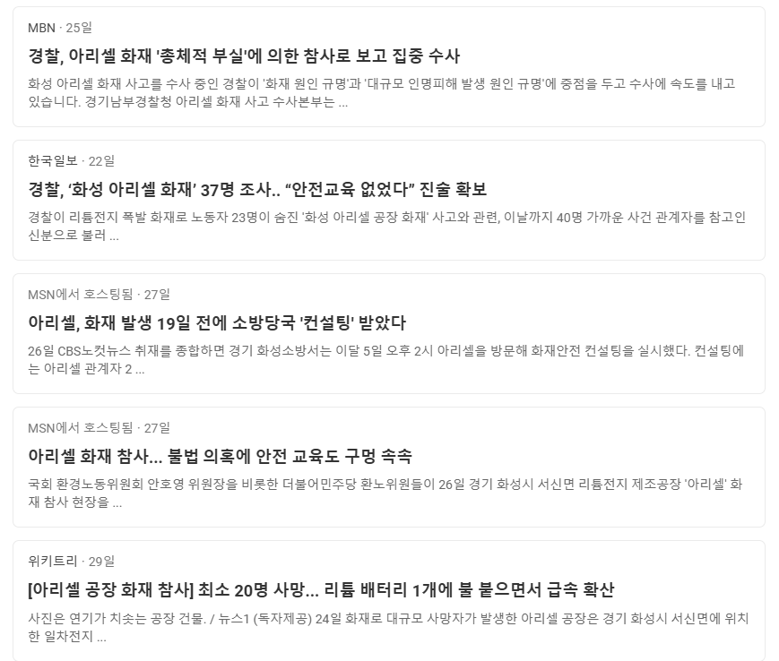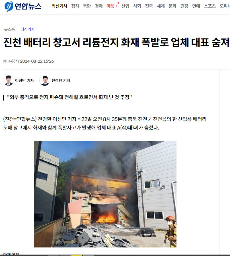 - 6월: 화성의 배터리 제조업체에서 발생한 대규모 화재(전소 및 사망자 발생).